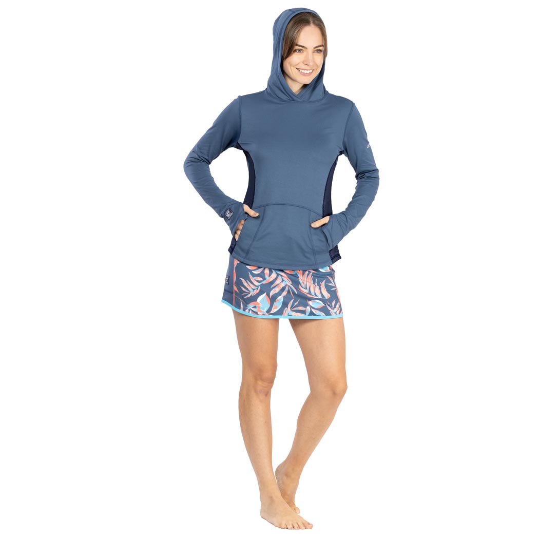 Te recomendamos esta hermosa falda skort, que aparte de práctica, complementará tu outfit, para esos días en la playa o las fiestas en la alberca, de pretina alta en color azul Capri, laterales en color gris acero, con bolsa en lado derecho, donde puedes guardar tus llaves, tus monedas o tu celular, frente y atrás de tela sublimada multicolor con motivo dracaena, cuenta con short para que tengas mayor comodidad en todas tus actividades, con jareta interna en cintura para mayor ajuste, de tela fresca, suave y ligera, que no guarda olores, y de secado ultra rápido, cuenta con nuestra certificación UPF50+ que cuida tu piel de los rayos solares.