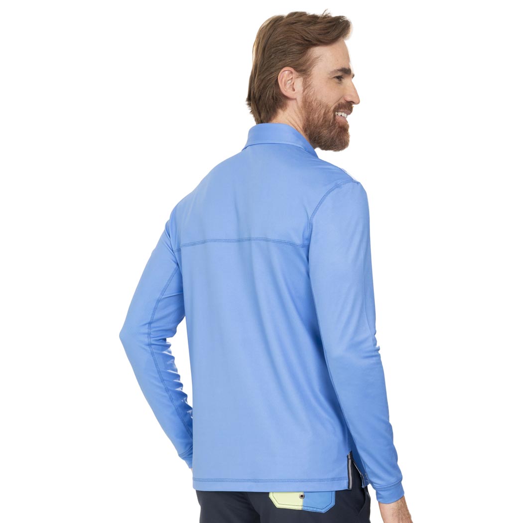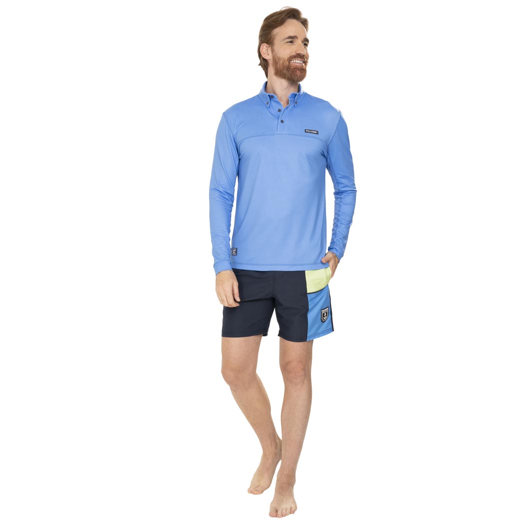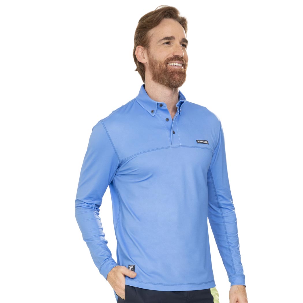 Polo para hombre de manga larga, confeccionado con un corte relajado que brinda comodidad y versatilidad, ideal para actividades al aire libre. Fabricado en color azul perry y certificado con protección UPF50+ para garantizar máxima resistencia a los rayos UV. Presenta una etiqueta bordada con logotipo en el pecho, diseño liso y un cuello con botonera en puntas reforzada con botones en aletilla para mayor durabilidad. Incluye detalles funcionales como aberturas en los costados con cinta deportiva, ofreciendo un equilibrio perfecto entre estilo, rendimiento y comodidad. Una pieza esencial para un look sofisticado y técnico