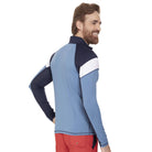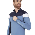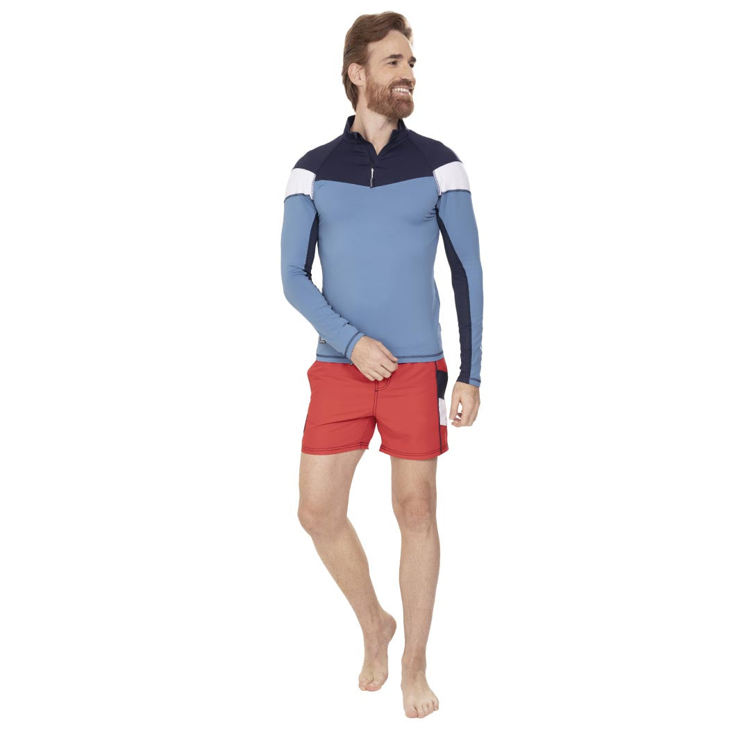 Playera Wet para caballero, color Azul Denim, con ajuste al cuerpo y cuello redondo. Cuello y pecho en color marino, mangas inferiores también. Cierre en pecho para mayor practicidad al cambio Franjas rectanculares horizontales en color blanco en brazos. Hecha en tela fresca, suave y ligera, de secado ultra rápido que no guarda olores. Protección UPF50+ para cuidar tu piel durante actividades acuáticas y días activos bajo el sol.