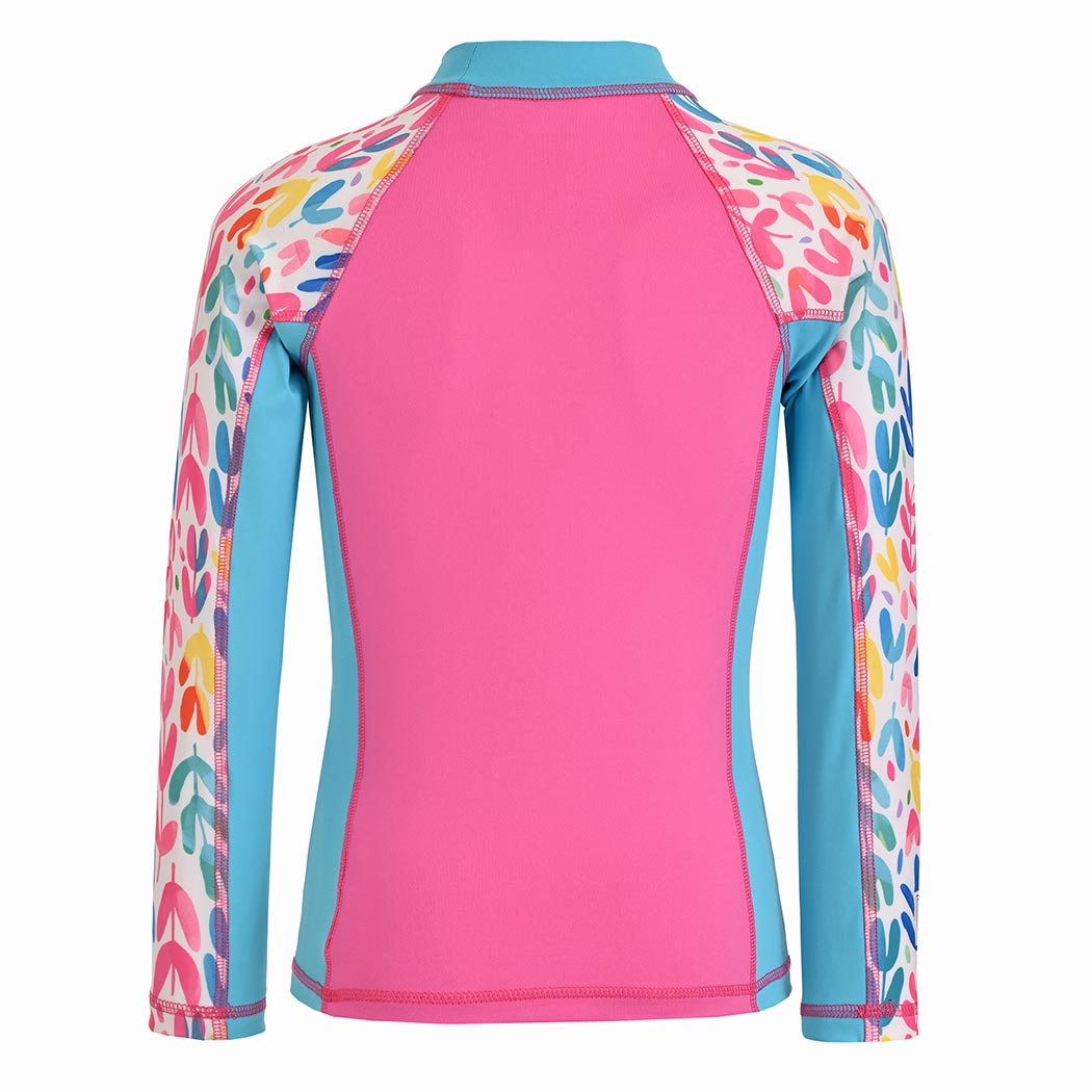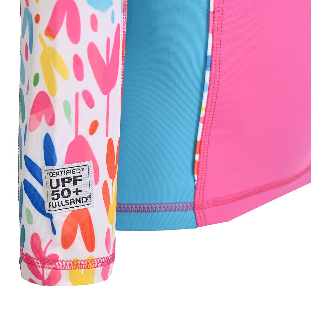 Diversión bajo el sol, sin preocupaciones. Esta playera rashguard de manga larga ofrece protección solar certificada UPF50+ para mantener a tu niña segura mientras disfruta del agua. Secado rápido, diseño colorido con estampados Colorful en mangas y vivos en el frente, más detalles en contraste en costados que realzan el movimiento. Logo estampado en el pecho. La prenda perfecta para playas, piscinas y aventuras al aire libre