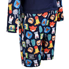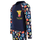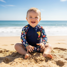 Que en las vacaciones solo te ocupes de pasarlo super con tu bebé, por eso te presentamos este body en color marino, con mangas y parte baja en tela sublimada multicolor de motivo animals, con nuestra firma y una divertida carita de jirafa en pecho lado izquierdo estampados, con cierre en el frente, y botones en entrepierna para que el cambio de pañal sea mas fácil, de tela fresca, suave y ligera, que no guarda olores, sobre todo cuenta con nuestra recomendación UPF50+ que mantendrá la piel de tu pequeño protegida de los rayos solares, recomendable para actividades acuáticas, de secado ultra rápido.