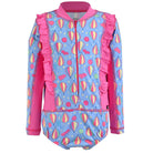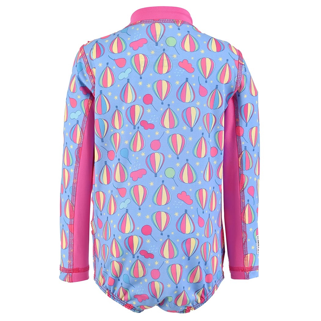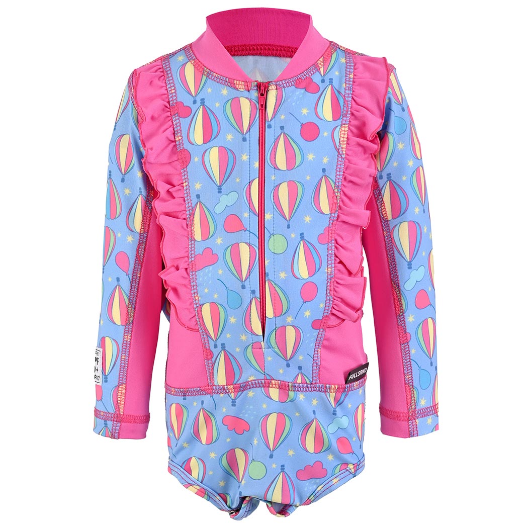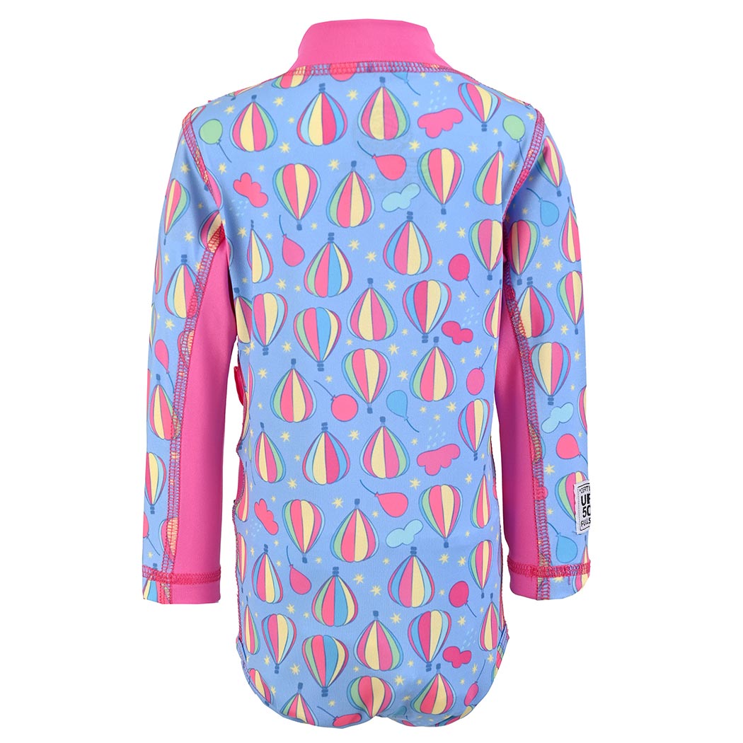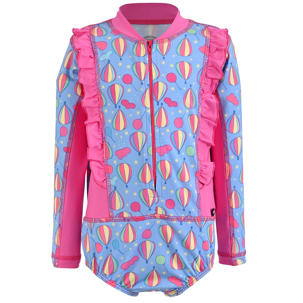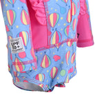 Este pañalero, ideal para actividades al aire libre y acuáticas, ofrece máxima protección contra los rayos UV con su certificación UPF 50+. Cuenta con un práctico cierre frontal en color blanco, estampado de globos en el delantero, espalda, mangas y calzón, y detalles en tela lisa en los costados del cuerpo y mangas. Su diseño incluye un corte de calzón simulado y olanes verticales en el delantero, añadiendo un toque de elegancia. Con etiqueta TAB bordada en el costado izquierdo, este pañalero combina estilo, comodidad y protección, ¡perfecto para mantener a tu bebé fresca y segura bajo el sol!