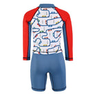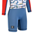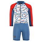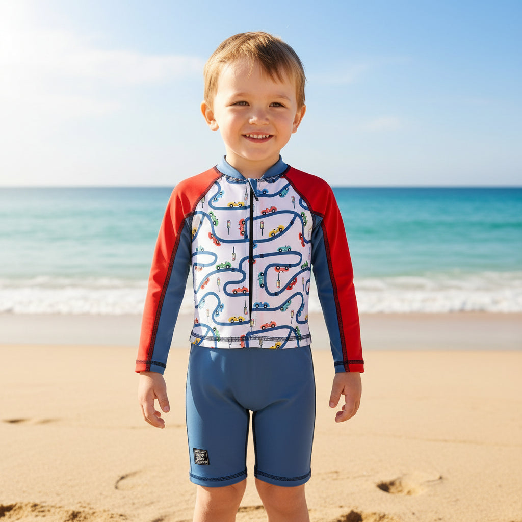 Este body de manga larga está listo para acompañar cada aventura bajo el sol. Con cierre al frente para mayor practicidad, combina mangas superiores en rojo con cuello y detalles tipo biker en azul denim, logrando un look moderno y divertido. El cuerpo en tela sublimada con motivo de coches aporta un toque lleno de energía y movimiento. Su tela fresca, ligera y de secado rápido ofrece protección solar UPF 50+ y no guarda olores, brindando comodidad durante horas de juego acuático. Ideal para niños activos que disfrutan el agua y la velocidad.